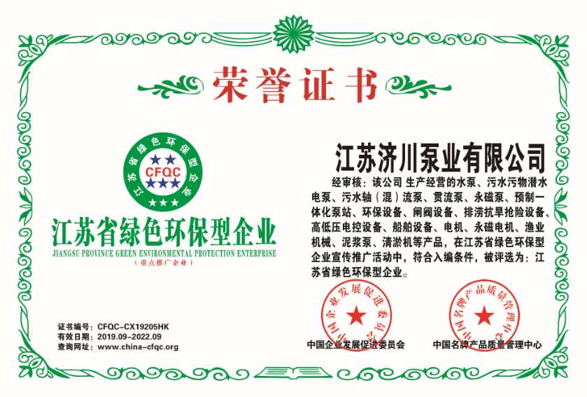 江蘇省綠色環(huán)保型企業(yè)榮譽證書